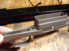 magazine well. The magazine is plastic, holds three rounds, and