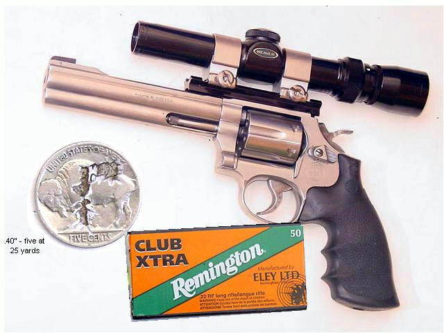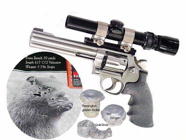 The Scoped 617 weighs 62 ounces. The NRA center was shot one handed. The small groups are from the bench at 25 yards with CCI