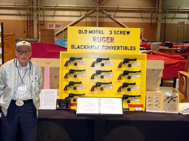Matt’s fine display covered all barrel lengths of the .357 Magnum and .44 Magnum “Flattops.” The three variations of the New Model 50th Anniversary .357 & .44 Flattops were also displayed, along with a factory Matched Set of Anniversary Flattops. Sets of extremely rare original factory ivory and rare stag grips along with memorabilia, American Rifleman original advertisements for the Flattops, a 1957 catalog, and Shooting Times advertisements for the 50th Anniversary guns were included. All guns were boxed except the 10” .357 Flattop. “OLD MODEL 3 SCREW RUGER BLACKHAWK CONVERTIBLES”