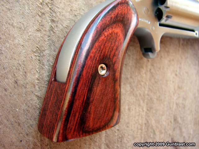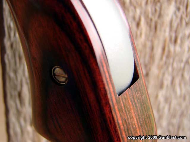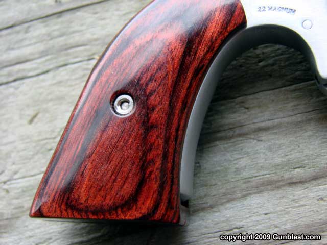 revolver. The grips are square-butt laminated wood, and contrast