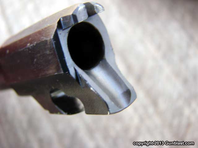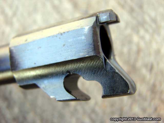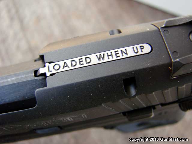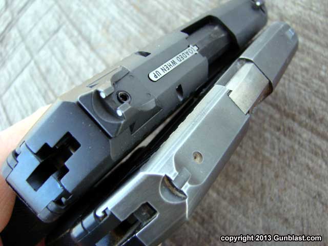 loaded-chamber indicator atop the slide. The magazine disconnect