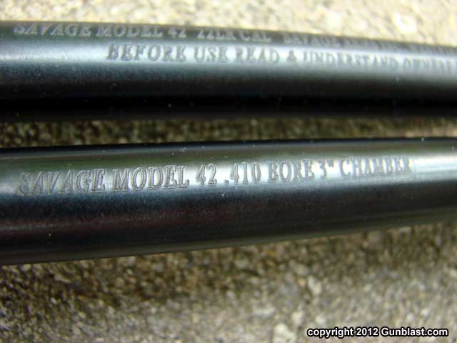 Upper barrel is chambered for the 22 long rifle cartridge. Lower barrel is chambered for 410 bore shotshell.