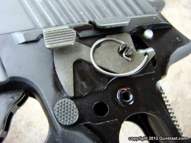 Top to bottom: magazine release, decocker, slide lock